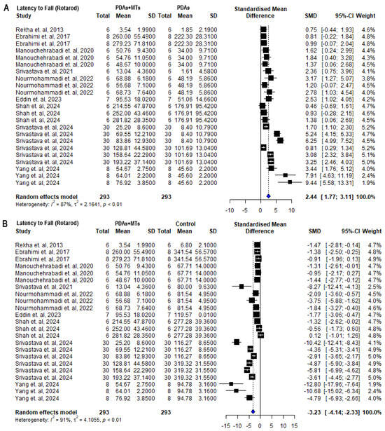 With respect to the Rotarod test, which evaluates motor coordination through locomotor activity on a rotating rod [59], 8 out of 10 publications reported that PDAs took significantly more time to fall off the apparatus when administered with at least one of the doses evaluated in MTs, mostly the higher dose (20–50 mg/kg i.p. and 50–100 mg/kg p.o.). Tancheva et al. [46] measured the number of falls and reported less falls in PDAs administered with myrtenal than PDAs. A study by Nourmohammadi et al. [53] on thymol reported that it increased the time of stay on the Rotarod in animals injected with 6-OHDA, though not significantly; however, it was capable of reversing the negative effect on the distance traveled in the rod. The meta-analysis of time-to-fall measurements using the Rotarod apparatus revealed a significant decrease in the duration that PDAs remained on the rotating rod compared to control animals (SMD = −6.05 [95% CI: −8.45 to −3.65] p < 0.01 I2 = 93%) (Figure S1). PDAs with monoterpene therapy (PDAs + MTs) remained on the Rotarod longer before falling compared to PDAs (SMD = 2.44 [95% CI: 1.77 to 3.11] p < 0.01 I2 = 87%) (Figure 3A). This suggests that the administration of MTs enhances motor coordination in PDAs. However, compared to control animals, PDAs + MTs took less time to fall (SMD = −3.23 [95% CI: −4.14 to −2.33] p < 0.01 I2 = 91%) (Figure 3B).