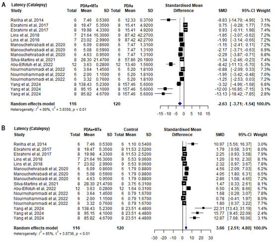 Another important behavioral test analyzed was the Catalepsy test, which assesses postural rigidity and ability to start movements [60]. Seven out of nine publications analyzed reported that PDAs + MTs took less time to start a movement than PDAs. Meta-analysis of the latency of movement showed that PDAs took more time to finish the test than control animals (SMD = 5.31 [95% CI: 3.00 to 7.63] p = 0.00001 I2 = 89%) (Figure S2). The PDAs + MTs showed to decrease the latency in the Catalepsy test, evidencing an attenuation of the motor impairment induced in these animals (SMD = −2.63 [95% CI: −3.71 to −1.54] p < 0.01 I2 = 88%) (Figure 4A). The latency of the PDAs + MTs was not as low as the latency of control animals, indicating that they still showed more rigidity than healthy subjects (SMD = 3.66 [95% CI: 2.51 to 4.80] p < 0.01 I2 = 85%) (Figure 4B).