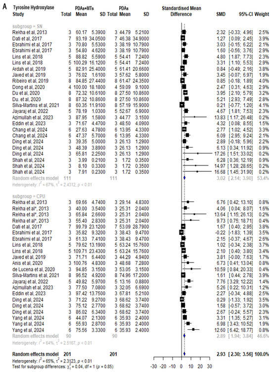 Meta-analysis of the results of TH shows a decrease in PDAs compared to control animals. This was analyzed both in the SN, where the nuclei of dopaminergic neurons are located (SMD = −3.85 [95% CI: −5.02 to −2.68] p < 0.01 I2 = 64%), and in the CPU where these neurons project (SMD = −4.78 [95% CI: −6.61 to −2.94] p < 0.01 I2 = 69%) (Figure S3). Among the 20 publications included in the study, 10 measured TH in both the SN and the CPU, 6 focused exclusively on the SN, and 4 concentrated solely on the CPU. The most reported monoterpene was carvacrol, appearing in 4 studies that measured TH. Results from PDAs showed that PDAs + MTs had a significantly higher TH content, both in the SN (SMD = 3.02 [95% CI: 2.14 to 3.90] p < 0.01 I2 = 67%) and in CPU (SMD = 2.89 [95% CI: 1.94 to 3.84] p < 0.01 I2 = 64%) (Figure 5A). The effect of MTs in increasing TH levels was similar in both brain regions, though it was slightly greater in SN. Differences between doses evaluated in a single study were varied, although most studies reported that TH content increased the most with the highest dose. Ebrahimi et al. [56] reported an increase of the TH-enhancing effect with 15 mg/kg thymoquinone in CPU, compared with 7.5 mg/kg thymoquinone, but a decrease in SN. Lins et al. [33] reported that a dose of 25 mg/kg of carvacrol led to an increase in TH levels in both brain structures compared to 12.5 mg/kg. Rekha et al. [39] reported that 100 mg/kg geraniol was able to increase TH signal compared with 50 mg/kg, but also reported that the effect with 200 mg/kg geraniol was lower. Still, meta-analysis showed that PDAs + MTs had significantly lower TH content in SN (SMD = −2.17 [95% CI: −2.91 to −1.42] p < 0.01 I2 = 66%) and CPU (SMD = −2.59 [95% CI: −3.64 to −1.55] p < 0.01 I2 = 74%) than control animals (Figure 5B).
