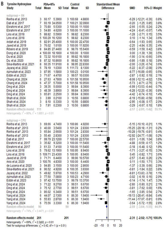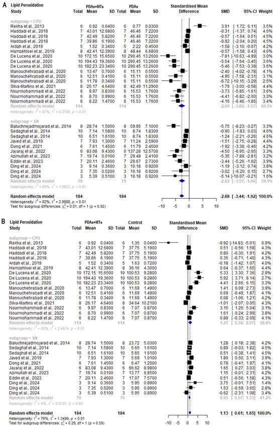 Meta-analysis of results from MDA quantification assays shows that PDAs present higher MDA content than control animals both in CPU (SMD = 2.21 [95% CI: 0.39 to 4.03] p < 0.01 I2 = 88%) and SN (SMD = 2.91 [95% CI: 2.02 to 3.81] p < 0.01 I2 = 50%) (Figure S4). However, it is observed that the PDAs + MTs exhibit lower levels of MDA and, consequently, reduced lipid peroxidation compared to the PDAs in both the CPU (SMD = −2.69 [95% CI: −3.82 to −1.57] p < 0.01 I2 = 87%) and SN (SMD = −2.62 [95% CI: −3.57 to −1.66] p < 0.01 I2 = 69%) (Figure 7A). When compared with control animals, PDAs + MTs still had higher MDA content in both structures (CPU: SMD = 1.21 [95% CI: 0.34 to 2.07] p < 0.01 I2 = 85%; SN: SMD = 0.95 [95% CI: 0.57 to 1.33] p < 0.01 I2 = 4%) (Figure 7B).