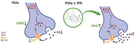 PDAs show decrease in DA content, DA metabolites, and DA neuron markers, such as TH, DAT, and VMAT, in SN and CPU. Publications with DAT and/or VMAT measurements reported an increase in their content with MT therapy, particularly, borneol, geraniol, linalool, and thymoquinone [27,38,40,42,57]. Other studies measure DA in brain tissue with chromatographic or fluorometric techniques, showing an increase of DA concentration, in SN, CPU, or whole brain, in PDAs-MTs [27,38,39,42,46,51,54,56].