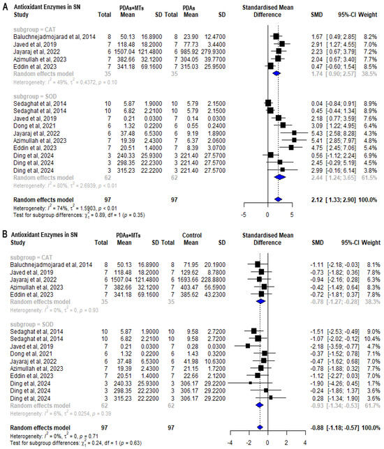 Determination of antioxidant enzymes’ activity or concentration in biological samples is another useful parameter to measure the oxidative state of the brain. CAT and SOD are the two main antioxidant enzymes reported in the literature. Meta-analysis of results shows that PDAs have reduced the activity and/or content of the antioxidant enzymes in the SN (CAT: SMD = −2.68 [95% CI: −3.82 to −1.54] p < 0.01 I2 = 59%; SOD: SMD = −3.64 [95% CI: −5.05 to −2.23] p < 0.01 I2 = 70%) (Figure S5). On the other hand, PDAs + MTs achieve higher antioxidant enzyme content and/or activity than PDAs according to the meta-analysis results (CAT: SMD = 1.74 [95% CI: 0.90 to 2.57] p < 0.01 I2 = 49%; SOD: SMD = 2.44 [95% CI: 1.24 to 3.65] p < 0.01 I2 = 80%) (Figure 8A). Compared to control animals, however, concentration/activity of these enzymes remained significantly lower at the time of measurement (CAT: SMD = −0.78 [95% CI: −1.27 to −0.28] p < 0.01 I2 = 0%; SOD: SMD = −0.93 [95% CI: −1.34 to −0.53] p < 0.01 I2 = 6%) (Figure 8B).