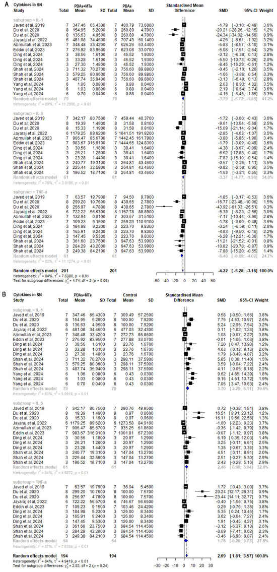 The main inflammatory parameters assessed were the concentration or gene expression levels of pro-inflammatory cytokines, with most publications that measured them (62%) focusing on the SN. The meta-analysis of results from quantification of cytokines IL-1, TNF-α, and IL-6 in SN, shows their significant increase in PDAs compared to control animals (IL-1: SMD = 7.21 [95% CI: 4.36 to 10.05] p < 0.01 I2 = 81%; IL-6: SMD = 4.14 [95% CI: 2.01 to 6.27] p < 0.01 I2 = 77%; TNF-α: SMD = 6.20 [95% CI: 2.86 to 9.54] p < 0.01 I2 = 86%) (Figure S6). PDAs + MTs showed lower concentration or gene expression of pro-inflammatory cytokines in SN than PDAs (IL-1: SMD = −3.79 [95% CI: −5.72 to −1.85] p < 0.01 I2 = 89%; IL−6: SMD = −3.37 [95% CI: −4.77 to −1.98] p < 0.01 I2 = 76%; TNF-α: SMD = −6.46 [95% CI: −8.89 to −4.02] p < 0.01 I2 = 82%) (Figure 9A). Standardized mean differences for the TNF-α were lower than for IL-1 and IL-6. When compared with control animals, IL-1 and IL-6 remained higher in concentration/gene expression levels in PDAs + MTs animals. However, TNF-α levels in PDAs + MTs were not significantly different from values in control animals (IL-1: SMD = 3.70 [95% CI: 2.29 to 5.11] p < 0.01 I2 = 83%; IL-6: SMD = 2.46 [95% CI: 0.98 to 3.94] p < 0.01 I2 = 84%; TNF-α: SMD = 1.76 [95% CI: −0.20 to 3.73] p = 0.078 I2 = 87%) (Figure 9B). This result suggests that MTs restore the levels of a key pro-inflammatory cytokine to control values in animals with parkinsonian pathology.