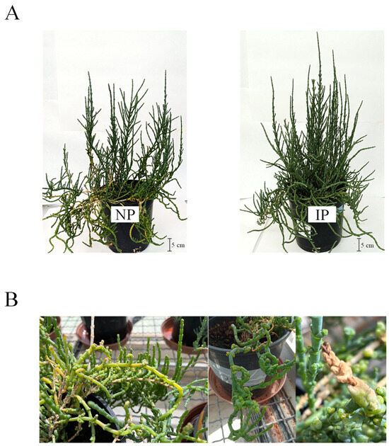 At the conclusion of the experimental period, visual observations revealed that IPs exhibited more robust growth compared to NPs, with a greater number of branches and increased height (Figure 1A). In terms of biomass, IPs demonstrated a 27% higher aboveground biomass than NPs (469 g vs. 375 g). Furthermore, NPs exhibited morphological abnormalities and symptoms indicative of salt stress, which were absent in IPs (Figure 1B). These findings suggest that IPs exhibited greater tolerance to the experimental conditions, as evidenced by enhanced biomass accumulation and the absence of salt-induced symptoms, in contrast to NPs.