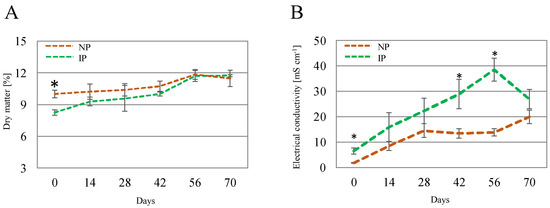 Concerning shoot DM, it displayed variations over time and between IPs and NPs (Figure 2A); at time 0, DM for IPs had a value of 8.24%, whereas values for NPs were significantly higher (10.0%). This can be linked to a hyperhydricity phenomenon derived from the in vitro origin of the IP [38]. This difference gradually narrowed, with similar values at the end of the experiment for IPs (11.7%) and NPs (11.5%). The electrical conductivity (EC) of the leachate (Figure 2B) exhibited elevated levels, which can be attributed to the high salinity of the salinized nutrient solution employed, with a conductivity of 41.2 mS cm−1. Superior EC values in IPs than in NPs were found at some points, which suggests a more efficient uptake of nutrients for NPs; nevertheless, there was a drop in EC values for IPs at the last time point.
