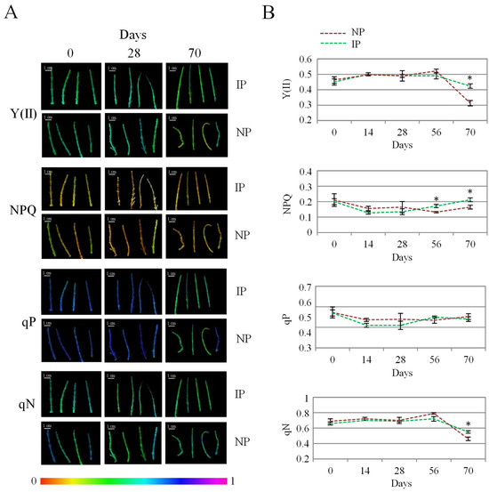 Evolution of photochemical [Y(II) and qP] and non-photochemical quenching (NPQ and qN) values for nursery (NP) and in vitro-derived (IP) plants at different times. (A) Colored images of apical shoot segments representing fluorescence intensity from black (0) to magenta (1) for the different variables at selected time points. (B) Data recorded at the different times, representing the mean ± the standard error (n = 4). Asterix symbols (*) represent significant differences for pairwise comparisons according to one-way ANOVA.