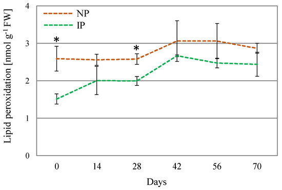 Lipid peroxidation levels for nursery (NP) and in vitro-derived (IP) plants at different times. Data are shown as the mean ± the standard error (n = 4). Asterix symbols (*) represent significant difference for pairwise comparison according to one-way ANOVA.
