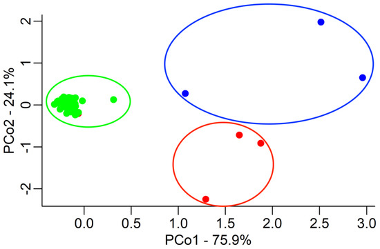 Principal Coordinate Analyses (PCoAs) were performed on the results of the three populations: LB (red), LC (blue), and field (green). Each accession is represented by a point in a two-dimensional space represented by the first two PCos, which, respectively, explain 75.9% (PCo1) and 24.1% (PCo2) of the total variations. The Euclidean distance between accessions is based on their genotypic differences.