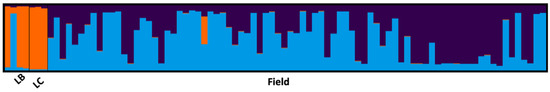The three groups showed a similar mean number of alleles per locus (NA): the LB population obtained a mean number of 2.00, the LC obtained 1.67, and the field obtained 3.00, and overall, the mean number of alleles per locus was 2.22.