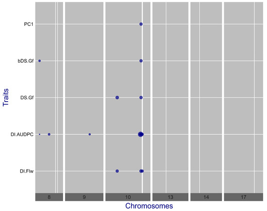 Plots of effect sizes for the associated markers to five SVW disease descriptors (DI.Flw, DI.AUDPC, DS.Gf, bDS.Gf, and PC1). Dot diameters are proportional to the effect size of the associated marker. Thinner vertical lines indicate the genomic positions of the closest SNPs to the SVW-resistance QTL’s peaks associated by Composite Interval Mapping analysis.