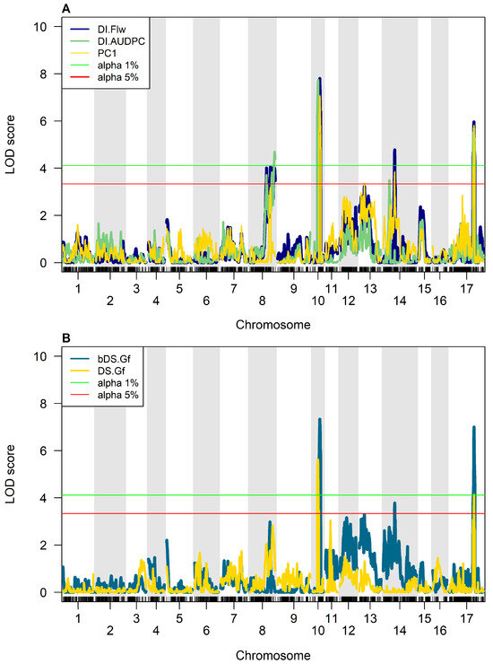 A total of 17 QTLs were identified by the CIM approach for SVW resistance distributed across CHR10, CHR17, CHR14, CHR08, and CHR13. CIM analysis determined LOD values of 4.15 and 3.34 as significance thresholds of α 0.01 and α 0.05, respectively. Twelve QTLs were significant with a 1% threshold and five QTLs with a 5% threshold. QTLs on CHR10 showed the highest LOD scores and the greatest impact on PhV for all traits. The numbers of QTLs detected per trait and chromosome were four, four, two, three, and four for DI.Flw, DI.AUDPC, DS.Gf, bDS.Gf, and PC1, respectively (Figure 2).