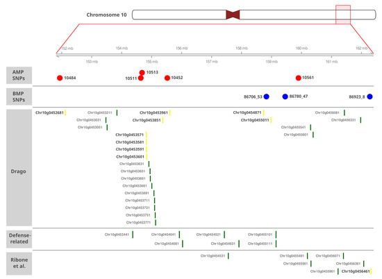 Region of 10.34 Mb corresponding to the major QTL for SVW resistance detected on CHR 10. Red points indicate the position of the SNP identified in the AMP. Blue points indicate the SNP identified in the BMP. Candidate R genes annotated by DRAGO3, CGs annotated with defense functions, and CGs identified in defense-related modules by Ribone et al. [58] are indicated at the bottom of the panel. The identification of the genes was obtained from the HanXRQ.v2.0 genome.