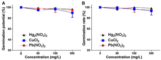 Effects of heavy metal ion stress on the germination potential and germination rate of V. radiata seeds: (A) effects of different concentrations of mercuric, copper, and lead ions on the germination potential of V. radiata seeds on day 3; and (B) effects of different concentrations of mercuric, copper, and lead ions on the germination rate of V. radiata seeds on day 7. Each data point represents the mean ± standard deviation from three independent experiments. Statistical significance was determined using ANOVA, with unmarked points indicating no significant difference compared to the control group.