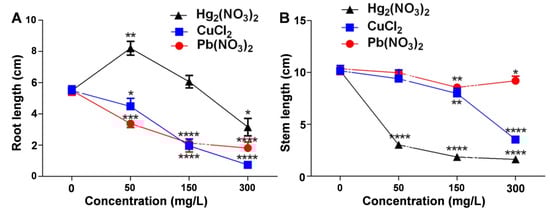 Effects of heavy metal ion stress on the root and stem growth of V. radiata seedlings: (A) effects of different concentrations of mercuric, copper, and lead ions on the root length of V. radiata seedlings; and (B) effects of different concentrations of mercuric, copper, and lead ions on the stem length of V. radiata seedlings. Each data point represents the mean ± standard deviation from three independent experiments. Statistical significance was determined using ANOVA, with * indicating p < 0.05, ** indicating p < 0.01, *** indicating p < 0.001, and **** indicating p < 0.0001. Unmarked points indicate no significant difference compared to the control group.