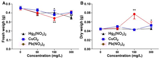 Comparison of the effects of heavy metal ion stress on the biomass of V. radiata seedlings: (A) effects of different concentrations of mercuric, copper, and lead ions on the fresh weight of V. radiata seedlings; and (B) effects of different concentrations of mercuric, copper, and lead ions on the dry weight of V. radiata seedlings under stress conditions. Each data point represents the mean ± standard deviation from three independent experiments. Statistical significance was determined using ANOVA, with * indicating p < 0.05 and ** indicating p < 0.01. Unmarked points indicate no significant difference compared to the control group.