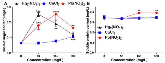 Effects of heavy metal ion stress on the physiological indices of V. radiata seedlings: (A) effects of different concentrations of mercuric, copper, and lead ions on the soluble sugar content of V. radiata seedlings; and (B) effects of different concentrations of mercuric, copper, and lead ions on the soluble protein content of V. radiata seedlings. Each data point represents the mean ± standard deviation from three independent experiments. Statistical significance was determined using ANOVA, with * indicating p < 0.05, ** indicating p < 0.01, *** indicating p < 0.001, and **** indicating p < 0.0001; unmarked points indicate no significant difference compared to the control group.
