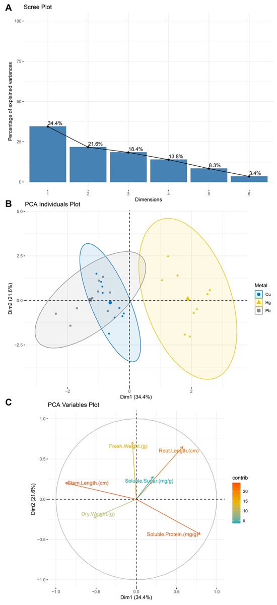 PCA results. (A) PCA after data standardization, showing the variance contribution rates of each principal component. (B) Distribution of the different heavy metal treatment groups (Cu, Hg, Pb) in the principal component space. Dots represent samples, and ellipses indicate the 95% confidence interval. Hg (yellow triangles) is positioned in the positive PC1 region, while Cu (blue circles) and Pb (gray squares) cluster in the negative PC1 region, with a partial overlap along PC2. (C) Contributions and directions of different variables in the principal component space, with the colors indicating the magnitudes of the contributions.