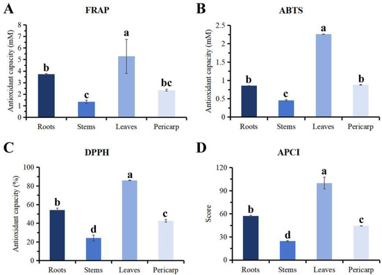 | Leaves | 5.28 ± 1.47 a | 2.26 ± 0.0061 a | 85.95 ± 0.26 a | 100.00 ± 7.67 a | 1 |