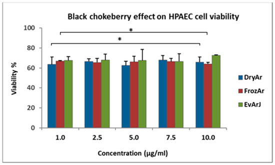 Results of the in vitro antiproliferative analysis of the BCK extracts on the HPAECs after 72 h of exposure to the selected samples using the MTT method (Data = mean ± SEM, * p < 0.05, vs. control [one-way ANOVA]). Legend: DryArs—extract obtained from dried berries; FrozArs—extract obtained from frozen berries; EvArJ—extract obtained from evaporated BCK juice.