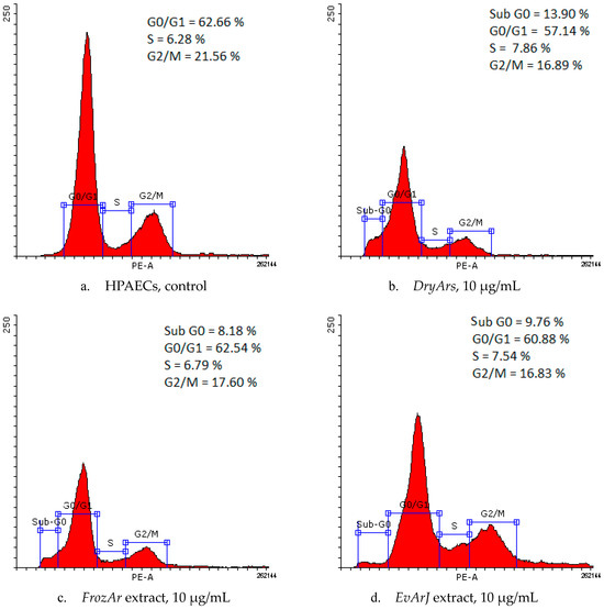 The evaluation of the results of the cell cycle analysis, provided by flow cytometry (Table 4 and Figure 2), reveals slight changes in the cell cycle phases after the cells were exposed to the BCK extracts. Decreases in the percentage of cells in the G2/M phase (from 21.56 ± 2.23% (control) to 16.83 ± 3.35% (EvArJ, 10 μg/mL), 16.85 ± 5.42% (DryArs, 10 μg/mL), and 17.60 ± 4.31% (FrozArs, 10 μg/mL) were observed, with the appearance of a sub-G0 phase for the highest concentration of the three BCK extracts: 13.90 ± 8.67% (DryArs), 8.18 ± 3.86% (FrozArs), and 9.76 ± 3.99% (EvArJ). For the DryArs, a decrease in the G0-G1 phase percentage (57.14 ± 4.30%) at 10 μg/mL was observed compared to the control, where the percentage of the G0-G1 population was 62.66 ± 4.22%.