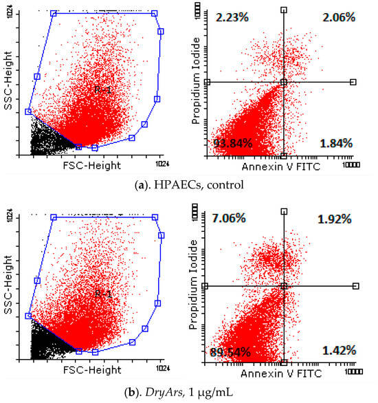 Analyzing the obtained results (Table 5, Figure 3) from testing the cell death of the HPAECs after exposure for 72 h to the BCK extracts using the Annexin V/PI method, a decrease in living cells from 93.84 ± 0.77% (control cells, untreated) to 89.54 ± 2.27% in the case of exposure to the DryAr extract (1 μg/mL), accompanied by a slight increase in the percentage of necrotic cells, from 2.23 ± 0.14% in the case of the control to 7.06 ± 2.99% in the case of exposure to the DryAr extract, was observed. As the extract concentration increased, the percentage of living cells decreased to 80.82 ± 4.86% (DryAr extract, 10 μg/mL), and a new population of dying cells, R2, emerged at 5.30 ± 1.21%, with the percentage of necrotic cells being 7.78 ± 4.20%. In the case of exposure of the HPAECs to the FrozAr extract, a very slight increase in the rate of cells in the early apoptosis and late apoptotic phases, independent of the concentration to which the cells had been exposed, was noted without statistical significance. Notably, no changes were observed for the BCK evaporated juice extract.