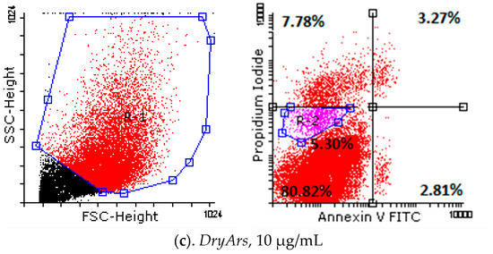 The cell cycle analysis was performed by means of flow cytometry. The cells, at a density of 2 × 105 cells/well, were grown on 6-well plates for adherent cells (Greiner bio-one, Gmbh, Germany) and left for 24–28 h for attachment to the plate. Subsequently, the culture medium was removed, and a fresh medium containing the test extracts at final concentrations of 1 μg/mL and 10 μg/mL was added. The untreated cells were used as the control, and the cells treated with the solvent DMSO (0.01%) were used as the solvent control. After an incubation time of 72 h, the cells were trypsinized, collected, and fixed with 50% cold ethanol for a minimum of 30 min at 4 °C. After centrifugation (1500 rpm, 5 min, 22 °C), the cells were washed twice with D-PBS (ATCC 30-2200). Subsequently, 100 μL of propidium iodide (concentration, 100 μM) (Invitrogen, Carlsbad, CA, USA) was added for the marking of DNA (deoxyribonucleic acid) and the cells were incubated for 10 min in the dark. A fluorescence-activated cell sorter, the FACSCalibur flow meter (Becton-Dickinson, Franklin Lakes, NJ, USA), was used for data acquisition, and Flowing software 2.5.1 was used for the analysis of the cell cycle results [78].
