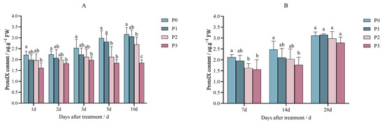 The ProtoIX content in Jingu 21 decreased after the penoxsulam (P0, P1, P2, and P3) treatment in the pot and field experiments, and the decrease trend was gradual with an increase in the spraying dose.