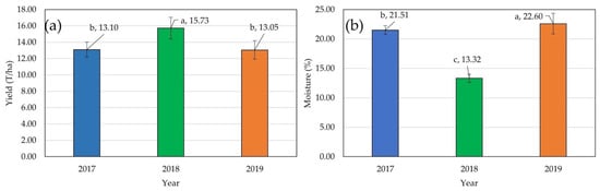 The average grain yield of all evaluated hybrids ranged from 13.05 t ha−1 in 2019, 13.10 t ha−1 in 2017, to 15.73 t ha−1 in 2018. The average grain moisture ranged from 13.32% in 2018, 21.51% in 2017, to 22.60% in 2019 (Figure 1).