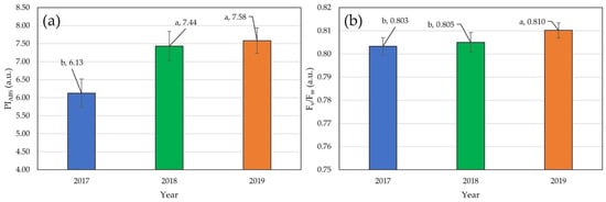 Mean values of fluorescence traits: different letters above the columns represent statistically significant differences: (a) average scores for photosynthetic efficiency (PSIABS) in three seasons; (b) average scores for quantum yield (Fv/Fm) in three seasons.