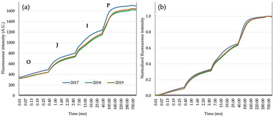 Transients of chlorophyll a fluorescence: (a) native transients of chlorophyll a fluorescence in flowering time across three years and all hybrids; (b) normalized transients of chlorophyll a fluorescence in flowering time across three years and all hybrids.