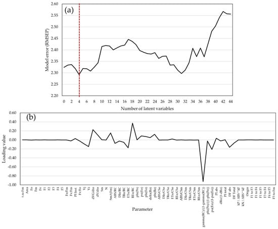 The model for grain moisture predictions: (a) error of the model (RMSEP) with biophysical chlorophyll a fluorescence parameters as predictors by increasing the number of latent variables (red line shows the lowest RMSEP value); (b) loading values of chlorophyll a fluorescence biophysical parameters in the PLS model with 4 latent variables for GM predictions.