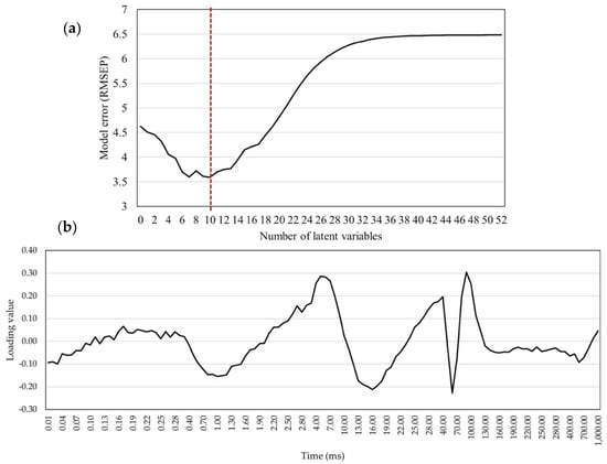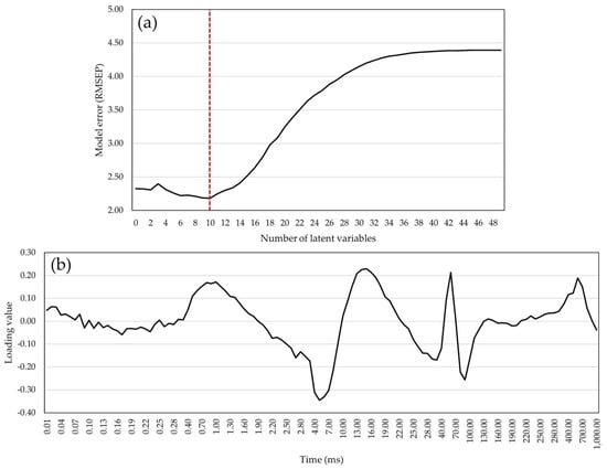 The model for grain moisture predictions: (a) error of the model (RMSEP) for GM predictions with chlorophyll a fluorescence transients as predictors by increasing the number of latent variables (red line shows the lowest RMSEP value); (b) chlorophyll a fluorescence loading values in the PLS model with 10 latent variables for GM predictions.