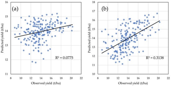 Grain yield predictions: (a) GY predicted with the calibrated PLS model using 58 chlorophyll a fluorescence biophysical parameters; (b) GY predicted with the calibrated PLS model using 118 chlorophyll a fluorescence transients.