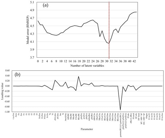 With the increase in the number of latent variables, the increase in the RMSEP (root mean square of predictions) values was determined using 58 biophysical parameters for GY prediction. A total of 44 latent variables (LVs) were estimated, and the lowest RMSEP value (2.292) was scored with 4 LVs (Figure 4a). Therefore, the model with four LVs was used for GY prediction as a calibrated model. The loading values of biophysical parameters in the calibrated model are shown in Figure 4b.