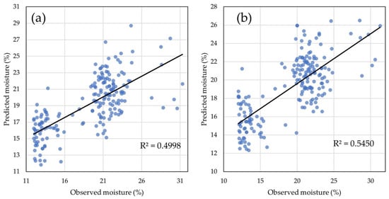 The models for grain moisture predictions: (a) GY values predicted with the calibrated PLS model using 58 chlorophyll a fluorescence biophysical parameters; (b) GM values predicted with the calibrated PLS model using 118 chlorophyll a fluorescence transients.