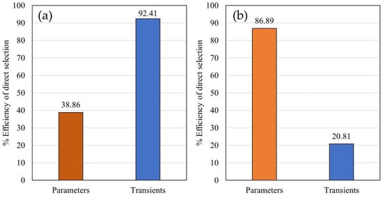 The efficiency of indirect selection for GY by using values predicted with biophysical parameters was lower (38.86%) compared to efficiency using values predicted with ChlF transients (92.41%) (Figure 10a). The efficiency of indirect selection for GM by using values predicted with biophysical parameters was relatively high (86.89%) and significantly lower by using values predicted with transients (Figure 10b).