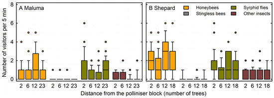 Numbers of honeybees (Apis mellifera L.), stingless bees (Tetragonula Moure spp.), syrphid flies (Syrphidae latreille spp.), and other insects visiting the flowers of (A) ‘Maluma’ and (B) ‘Shepard’ avocado (Persea americana Mill.) trees per 5 min period. Medians are presented with 25th and 75th percentiles (boxes), 10th and 90th percentiles (whiskers), and outliers (circles). The four medians and data distributions within each insect group for each avocado cultivar do not differ significantly (median and Kruskal–Wallis tests, respectively; p > 0.05; n = 24–28).