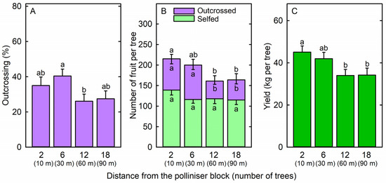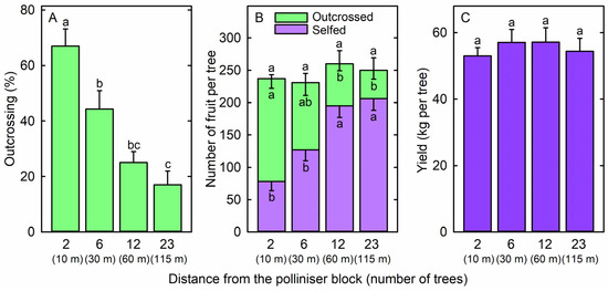 (A) Outcrossing rate among fruit, (B) number of outcrossed fruit, number of selfed fruit, and total number of fruit, and (C) fruit yield of ‘Maluma’ avocado (Persea americana Mill.) trees located at 2 trees (10 m), 6 trees (30 m), 12 trees (60 m), or 23 trees (135 m) from a block of ‘Shepard’ polliniser trees. Means (+SE for outcrossing rate, total number of fruit, and fruit yield; −SE for number of selfed fruit and number of outcrossed fruit) with different letters are significantly different (random block ANOVA and Tukey’s HSD test; p < 0.05; n = 10 trees).