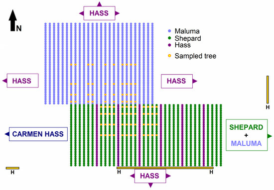 We selected four ‘Maluma’ trees in each of 10 non-consecutive rows between the 7th and 22nd rows of a 26-row block of ‘Maluma’ trees (Figure 4). This block was surrounded on more than three sides by large blocks of ‘Hass’ and ‘Carmen Hass’, except that it adjoined the block of ‘Shepard’ and interplanted ‘Hass’ trees on its southern side (see [67]). We also selected four ‘Shepard’ trees in each of the 8th to 11th, 13th to 16th, and 18th to 21st rows of the 36-row block containing ‘Shepard’ and interplanted ‘Hass’ trees (Figure 4). This block adjoined the experimental ‘Maluma’ block on its northern side, a block of ‘Hass’ trees on its northeastern side, the block of ‘Shepard’ and interplanted ‘Maluma’ trees on its eastern side, and large blocks of ‘Hass’ and ‘Carmen Hass’ on its southern and western sides, respectively (see [67]). We selected the 2nd, 6th, 12th, and 23rd trees from the southern end of the 46-tree-long rows of ‘Maluma’ (Figure 4). The first tree at the southern end of each ‘Maluma’ row was immediately adjacent to the block of ‘Shepard’ and ‘Hass’ trees. We also selected the 2nd, 6th, 12th, and 18th trees from the northern end of the 35-tree-long rows of ‘Shepard’ (Figure 4). The first tree at the northern end of each ‘Shepard’ row was immediately adjacent to the block of ‘Maluma’ trees. The trees were 11 years old, and tree spacing was 10 m between rows and 5 m within rows. Therefore, the 2nd, 6th, 12th, and 23rd trees in each ‘Maluma’ row were 10 m, 30 m, 60 m, and 115 m, respectively, from the ‘Shepard’ trees, and the 2nd, 6th, 12th, and 18th trees in each ‘Shepard’ row were 10 m, 30 m, 60 m, and 90 m, respectively, from the ‘Maluma’ trees. The ‘Shepard’ trees were also either 10 m or 20 m from the interplanted rows of ‘Hass’ trees (Figure 4).