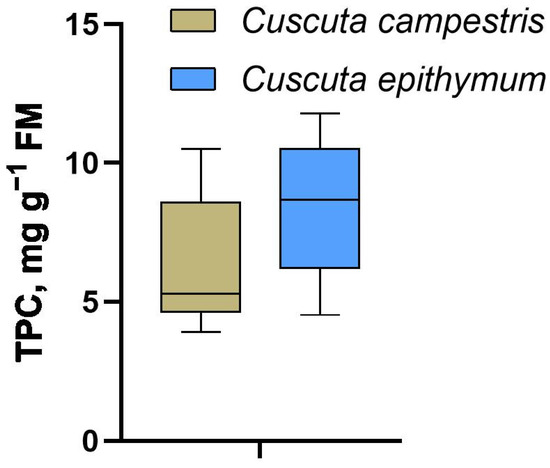 Box plot diagram of mean total polyphenolic content in Cuscuta campestris and Cuscuta epithymum, represented as gallic acid equivalents in mg g−1 fresh weight.