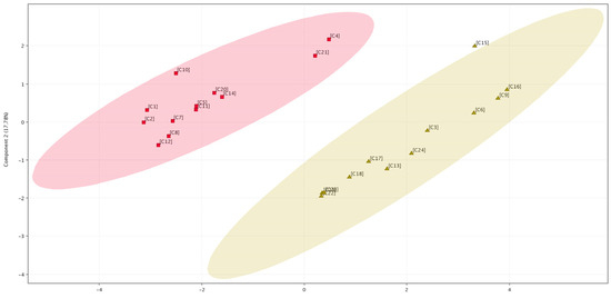 Analysis using the t-test showed that 8 of the 13 annotated compounds varied statistically significantly (p < 0.05) between the two species of C. campestris and C. epithymum, including kaempferol 3-O-β-(6′′-O-trans-p-coumaroyl)-glucopyranoside, chlorogenic acid, hyperoside, isoquercitrin, kaempferol-3-O-glalactoside, quercetin, kaempferol-3,7-O-diglucoside, and dicaffeoylquinic acid. The set of eight compounds was used for principal component analysis (PCA) as well as analysis based on hierarchical clustering (Figure 3 and Figure 4). PCA analysis showed the formation of two distinct groups of samples according to their species affiliation. The two components of the PCA plot together described 88.18% of the total variation in the system (Figure 3). From the PCA analysis, it is noticeable that the samples from C. epithymum had a higher value of Component 1, while those from C. campestris had a lower value of Component 1 and a higher value of Component 2. Samples C4 and C21 from the C. campestris group were more distant on the basis of flavonoid content compared with the other samples from this group, which were closely spaced on the PCA plot and, therefore, were characterized by a more similar flavonoid profile. Concerning the C. epithymum group, plants C6, C9, and C16 were closely spaced to each other but were more distant from the other eight samples of the species and, therefore, differences in the flavonoid profile were observed. Sample C15 was an outlier in the C. epithymum group because it lay outside the 95% confidence interval indicated by the brown ellipse in Figure 4. No grouping of samples by host was observed from the results. For example, C1 and C20, as well as C2 and C7 were not clustered together. Contributing to this may be also the fact, that in addition to the main parasitized species, the sampled Cuscuta specimens were also infesting nearby plants from other species, making it difficult to isolate the host influence.