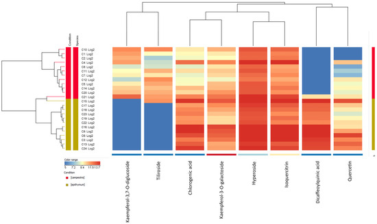 Hierarchical clustering by Cuscuta samples and the 8 flavonoid compounds. The dendrogram on the left shows the division of the samples into two main groups (sample C21 excluded), coincident with the Cuscuta species (C. epithymum and C. campestris). The dendrogram at the top shows the proximity of the base contents in the samples of the compounds annotated by Agilent HPLC, which varied statistically significantly between species.