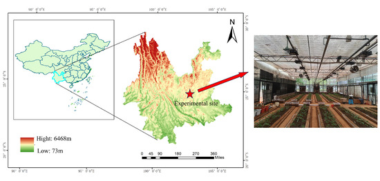 Field experiments were conduct at the Tianyuan Panax notoginseng planting base of Kunming University of Science and Technology in Kunming City, Yunnan Province, China (latitude N, longitude E), from September 2023 to June 2024. The altitude of the experiment site is 2067 m. The location has a subtropical monsoon climate. The experimental site is shown in Figure 1.
