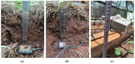 Sensor placement methods in experimental fields. (a) Sensor installation at 10 cm soil depth. (b) Sensor installation at 20 cm soil depth. (c) Air sensor installation.