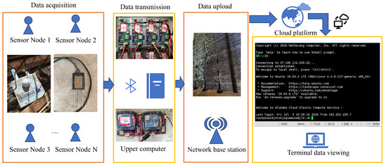 The sensor sends the collected data to the upper computer via a Bluetooth module. A computer can receive data from multiple sensors and uploads the data to the cloud via a 4G base station. Therefore, the user can access the cloud to view the data in real time. The workflow is shown in Figure 4.
