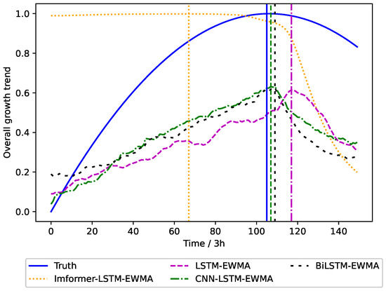 The proposed model effectively integrates deep learning with the Exponentially Weighted Moving Average (EWMA) method by utilizing historical data and real-time monitoring data. This integration enables accurate prediction of crop status decline trends 3–5 days in advance, allowing for timely irrigation warning signals to be sent to administrators. In contrast, traditional prediction methods, such as the LSTM-EWMA, CNN-LSTM-EWMA, and BiLSTM-EWMA models, exhibit significant latency, often issuing warning signals only after crops have already shown signs of status deterioration. This delayed warning may result in missing the optimal irrigation window, prolonging the period of water stress in crops and thereby affecting their normal physiological and metabolic processes [36].