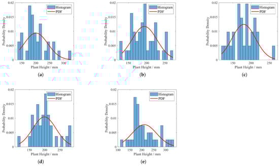 Plant height distribution in each experimental field before the experiment. (a) Experimental 1. (b) Experimental 2. (c) Experimental 3. (d) Experimental 4. (e) Experimental 5.
