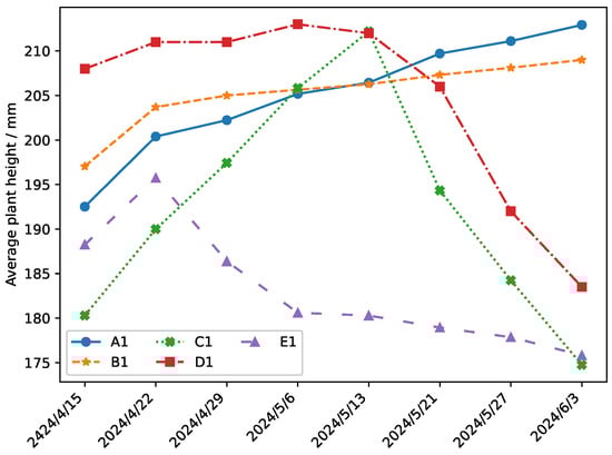 The data-driven irrigation strategy is adopted in the whole growth process of A1, while the traditional fixed irrigation volume strategy is adopted in the whole growth process of E1. As can be seen from Figure 14, the average plant height of E1 crops showed a growing trend in the early stage, but the growth state of crops kept declining in the later stage. A1 and B1 are in a good state of growth, B1 underwent a period of intervention regulation in the late stage, although in a growing trend, but its growth is not as good as A1. The growth state of D1 and C1 experiment fields has been in a good state after the data-driven intervention irrigation strategy in the early stage, but the growth state showed a significant decline after stopping intervention from the fourth time and the third time, respectively.