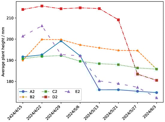 During the nearly two-month experiment, the average plant height growth of the crops in the experimental filed is shown in Figure 14. We repeated the measurements three times and took the average as the recorded height of each plant. Then, the average plant height of the whole experimental plot is calculated.