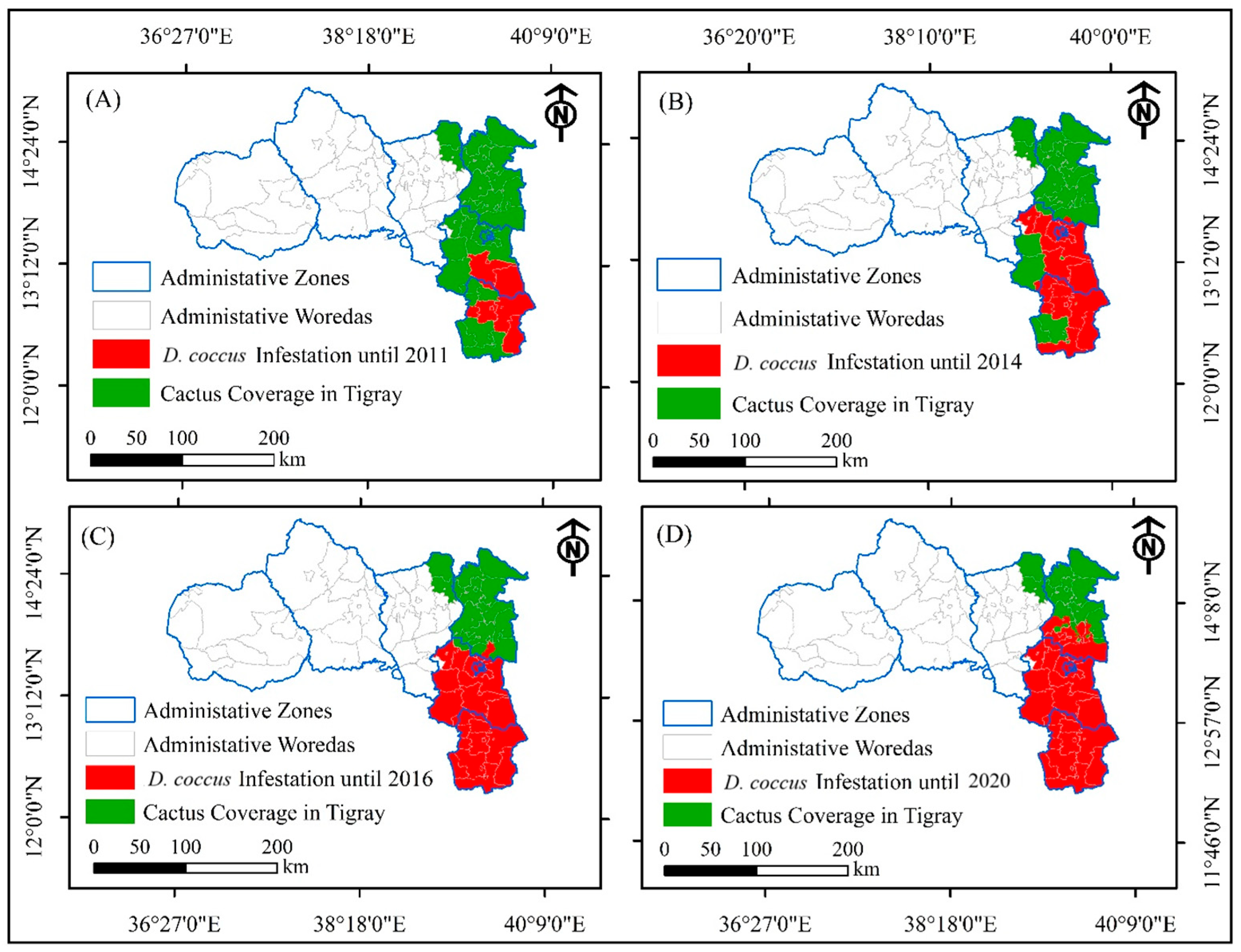 Gebreziher HG, Zebelo S, Gebremedhin YG, Teklu GW, Berhe YK, Berhe DH, Gerezgiher AK, Weldetnsae AK, Hailu Z, Weldeslasse GT, et al. Trends of Cochineal (Dactylopius coccus) Infestation as Affected by Armed Conflict, and Intervention Mechanisms for Sustainable Management in Tigray, Northern Ethiopia. Plants. 2025; 14(8):1228. https://doi.org/10.3390/plants14081228